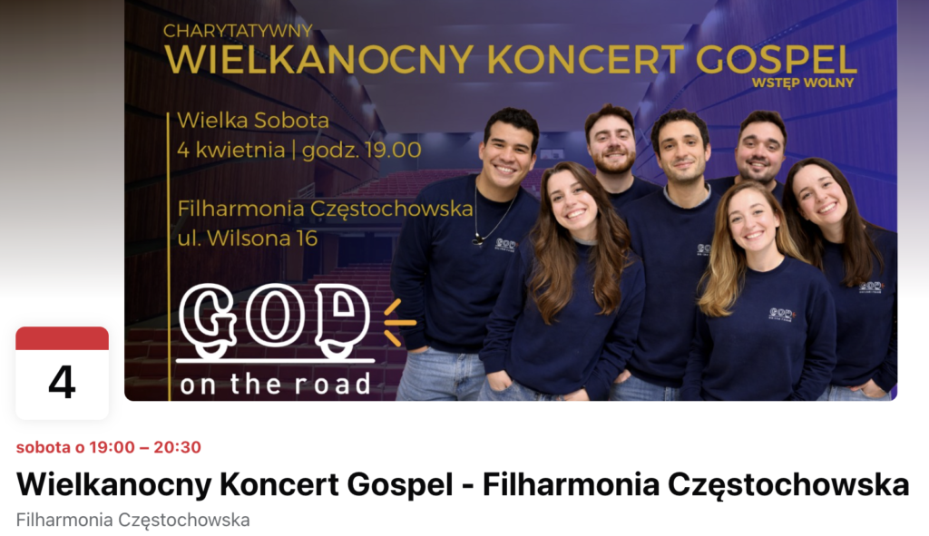 W sobotę 4 kwietnia 2026 roku o godzinie 19:00 w Filharmonii Częstochowskiej im. Bronisława Hubermana odbędzie się Wielkanocny Koncert Gospel — wyjątkowy wieczór pełen muzyki, nadziei i wielkanocnego przesłania. Wstęp na wydarzenie jest wolny a całość będzie transmitowana w Internecie.